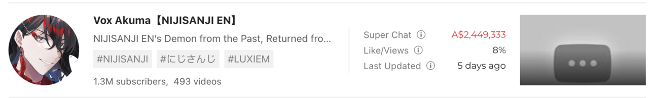 In 2022 female fans showed up in force. Vox Akuma a male talent from Ninjisanji English earned the 3rd spot for most superchatted channels in 2022. Earning USD$1.09m across 86,000 donations.